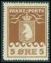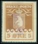 1910. 5 øre lysbrun takket 2 sider med violet skjold stp. tyndhed. AFA 8000,-