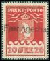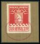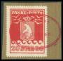 1915. 20 øre rød på klip med rødt ovalt stp. Udstedet Sydprøven (12.01).