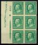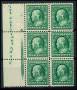 USA. 1908. 1 c. grøn i 6-blok med udgiver og lille stjerne, 1 mærke med fejl i NØ. Sc. 95 $