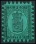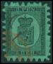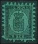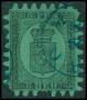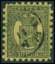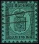 1866-67. Våbentype, 8 Penni, sort på grøn. Annulleret med rødt stempel.