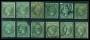1862. 1 c. olivengrøn. Planche med 12 stk. i blandet kvalitet. AFA 4200,-