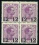 1926. 12/15 øre violet i 4-blok med variant: Delvist farvefyldt cirkel omkring venstre 15-tal, øvre venstre mærke er hængslet sjælden enhed. Attest LN.