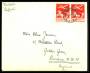 1934. 25 øre rød i par på brev til England, lokket rift i toppen.