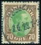 1918. 70 øre brun/grøn med variant: Farvet prik udenfor ramme til venstre.