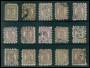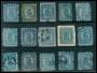 1866-67. Våbentype, 20 Penni, blå. Indstikskort med 15 mærker med defekter: manglende takker, tyndheder, folder m.v.