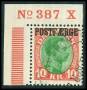 1930. 10 kr. rød/grøn i marginalstykke No. 387 X.