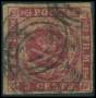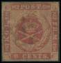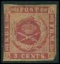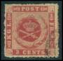 1855. 3 c. karmin brun gummi med hak i rammen ved øvre venstre posthorn. AFA 2800,-+