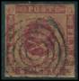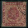 1856. 3 c. mørkkarmin med brun gummi. AFA 2800,-