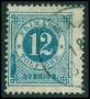 1877. 12 øre blå med stor blå farvestreg i venstre side.