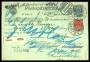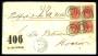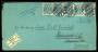 1895. Tofarvet, 4 Øre, 121. Tryk (3-stribe og par). Brev sendt fra KJØBENHAVN 30.5.02 til Bielefeld i Tyskland. Ankomststemplet BIELEFELD 31.5.02. Påsat label "Abgereist" og returneret til KJØBENHAVN...