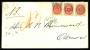 1875. Tofarvet, 8 Øre, 22. Tryk (2 parstykker). Postforskud sendt fra KJØBENHAVN 1.5. til Korsør. Annulleret med stumt pengepoststempel. Ankomststemplet med kombineret nummerstempel 37: KORSØR 1.5.