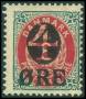 1904. 4/8 øre grå/rød med variant: Farveløs plet foran 4-tal. AFA 1500,-