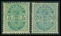 1884. 5 øre grøn i par (løs i perf.) 300med variant: Skarpt bøjet fane på 5. Attest Handest.