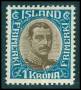 1907. 1 kr. blå/brun med stor farvespies i nord.