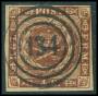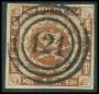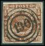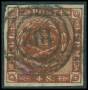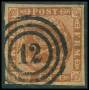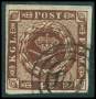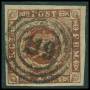 1858. 4 Skilling, brun. Annulleret med nummerstempel 12: CHRISTIANSFELDT. Flot stempel.