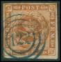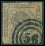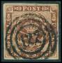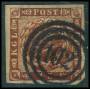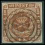 1858. 4 Skilling, brun. Annulleret med nummerstempel 125: NEUSTADT i BLÅ STEMPELFARVE. Bedre stempel.