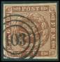 1858. 4 Skilling, brun. Annulleret med nummerstempel 103: HASLE. Flot stemplet.