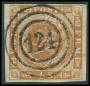1858. 4 Skilling, brun. Annulleret med nummerstempel 134: UETERSEN. Pragt-stemplet.