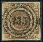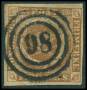 1854. FIRE R.B.S. Thiele III, gulbrun. Annulleret med nummerstempel 135:AHRENSBÖCK. Pragt-stemplet.