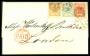 1864. 2 sk. blå tryk 6, 4 sk. rød tryk 12 og 8 sk. gulbrun på brev fra Helsingborg via Helsingør hvor brevet er blevet frankeret sendt til London. Attest CAM.
