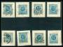 1877. 12 øre blå x 8 med diverse varianter.