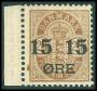 1904. 15/24 øre brun med variant: Afskåret øvre højre hjørne. AFA 1000,-