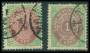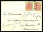 1896. Tofarvet, 1 Cent, 10. tryk, grøn/rødlig lilla (par). Tryksag sendt fra ST.THOMAS 8.12.1898 til Postmester J. Jensen, R. af D i København. Omadresseret fra St. Kongensgade til Værnedamsvej. Usædv...