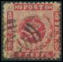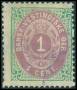 1873. 1 c. grøn/purpurlilla, let stp. og dobbelttak i højre side.