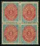 1873. 3 c. blå/rød tryk 7 i sammenholdt 4-blok. AFA 1200,-