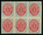 1876. 3 c. blå/rød tryk 2 pos. 84-86/94-96 i 6-blok inkl. 2 tynde rammer opklæbet på papir, småfejl. AFA 9200,-
