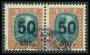 1925. 50 a/5 kr. brun/gråblå i par med plet i 0 i venstre mærke. AFA 800,-+