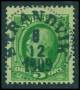 1891. 5 øre grøn med lang grøn farvespies i syd.