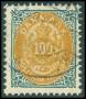 1875. Tofarvet, 100 Øre, grå/gul. Annulleret med KJØBENHAVN AP 13.6.1891 (LAP VIb).