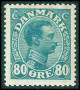 1915. 80 øre blågrøn med trekant ved venstre værdicirkel.