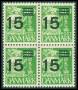 1940. 15/40 øre grøn i 4-blok, nv-mærke med ekstra tynd bjælke.
