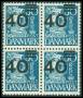 1940. 40/30 øre blå i 4-blok med forskudt overtryk.