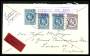 1943. 10 øre rød x 3 på ekspres søndagnsbrev med indhold til menig på skibet Fyen, Holmen.