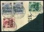 CHINA. 1906. Provisorier, 4 Cents / 10 Ofennig, rosa (4-stribe) og 10 Cents / 20 Pfennig, ultramarin. Lille brevklip annulleret CANTON 7.5.13.