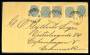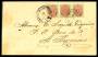 1873. Tofarvet, 4 Cents, 2. tryk (par og 3 enkelt). I alt 20 cents på brev af 2. vægtklasse sendt fra FREDERIKSTED 27.8.1900 til København. De 3 enkeltmærker har et rundt hjørne.