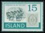 1973. 15 aur grå/brun med variant: Hestene forskudt ind i 3 sk. mærket, sjælden. Facit (511v1) uden pris.