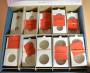 En kasse med tilbehør, bl.a. 2 stk. Lembit møntkasette med 4 bakker i hver (brun og sort), møntkapsler, Importa møntholdere med lim, samt et par møntkataloger fra Nordfrim