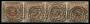 1858. 4 sk. brun tryk 5 i vandret 4-stribe med nr. stp. 26: Hjørring. Attest CAM.