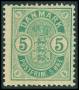1895. 5 øre grøn i helark gået op i perf. flere steder, brunlig lim.