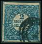 1852. 2 RBS blå Thiele pl. II58 type 2 med spids fodstreg. Attest LN.