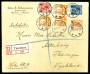 1928. Multifrankeret R-brev fra Thorshavn 29.11.28 til Tyskland med julemærke bundet til brevet på bagsiden, lukket rift i toppen.