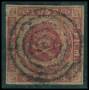 1856. 3 c. mørkkarmin med perfekt skydeskive stp.