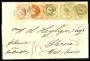 1867. 3 sk. lilla tryk 1, 4 sk. rød og 16 sk. oliven tryk 2 i 3-stribe på brev fra Kjøbenhavn til St. Croix. Attester Grønlund og CAM.