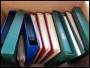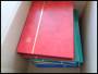 Flyttekasse med diverse motivmærker i bøger og løssider mv.