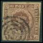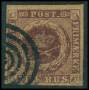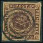 1851. 4 RBS pl. II-93 Ferslew 1a omv. vm. tæt klippet i nedre venstre hjørne, meget sjælden. Attester Jørgensen og LN.