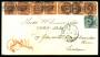 1863. 2 sk. blå og 4 sk. brun tryk 5 x 7 i alt 30 sk. på brev fra Kjøbenhavn via Hamburg til London, meget sjælden frankering, 2 stk. 4 sk. er let beklippede, denne kombination er ikke nævnt i DAKA. A...